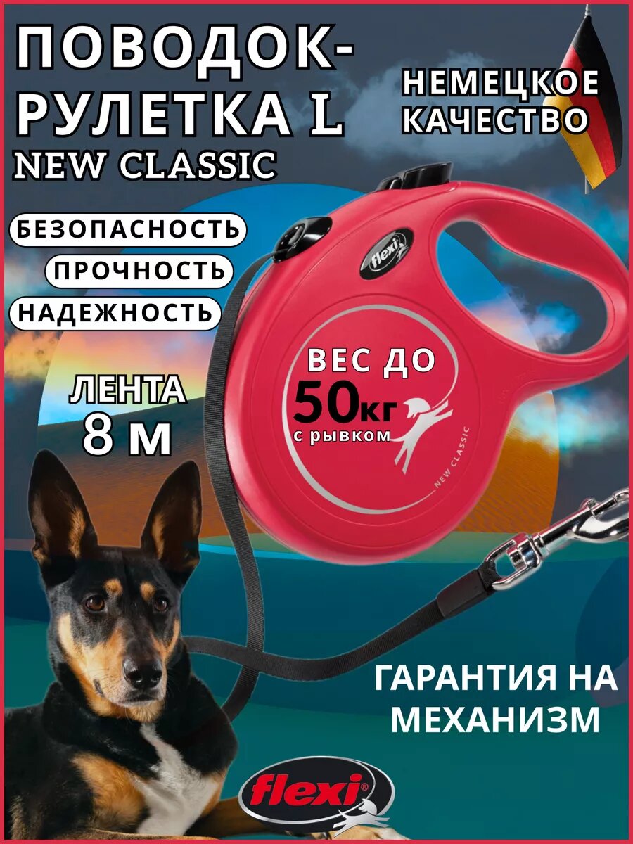 Купить flexi Рулетка-ремень для собак до 50кг, 8м, красная (New Classic L Tape 8 m, red) | New Classic L Tape 8 m, red, 0,6 кг