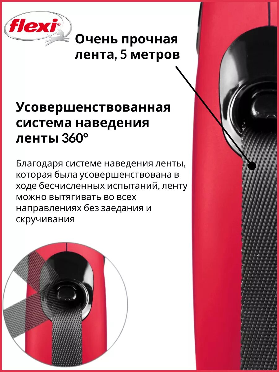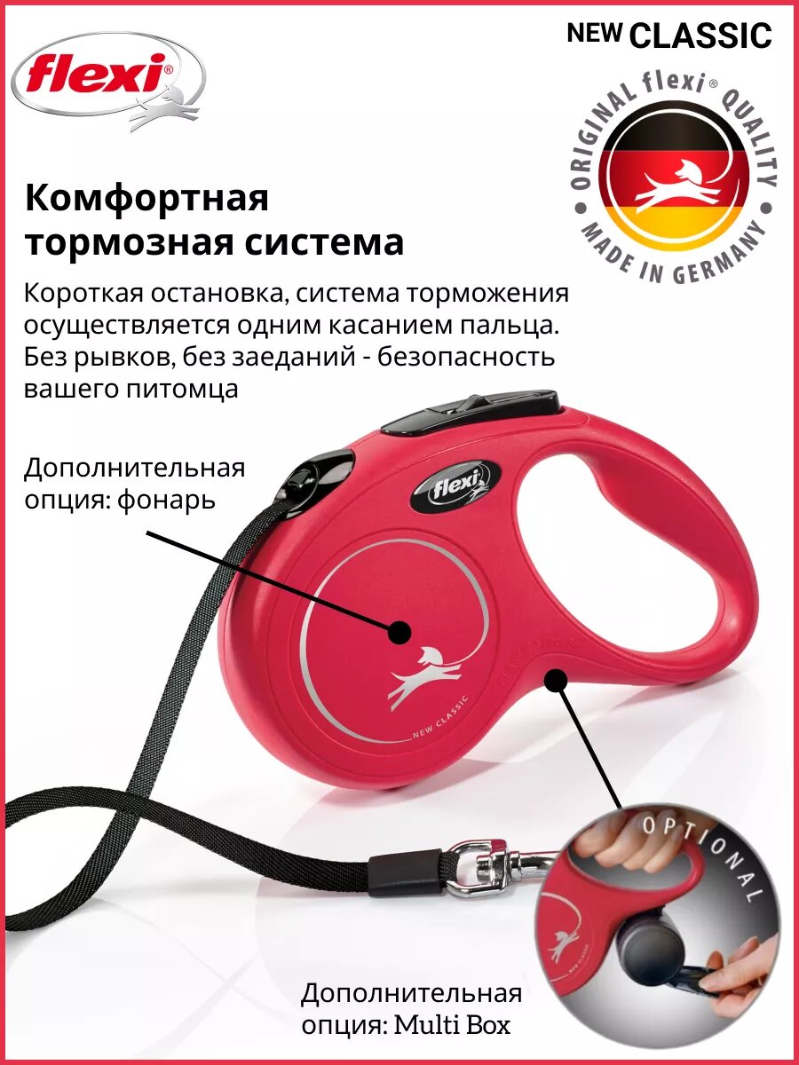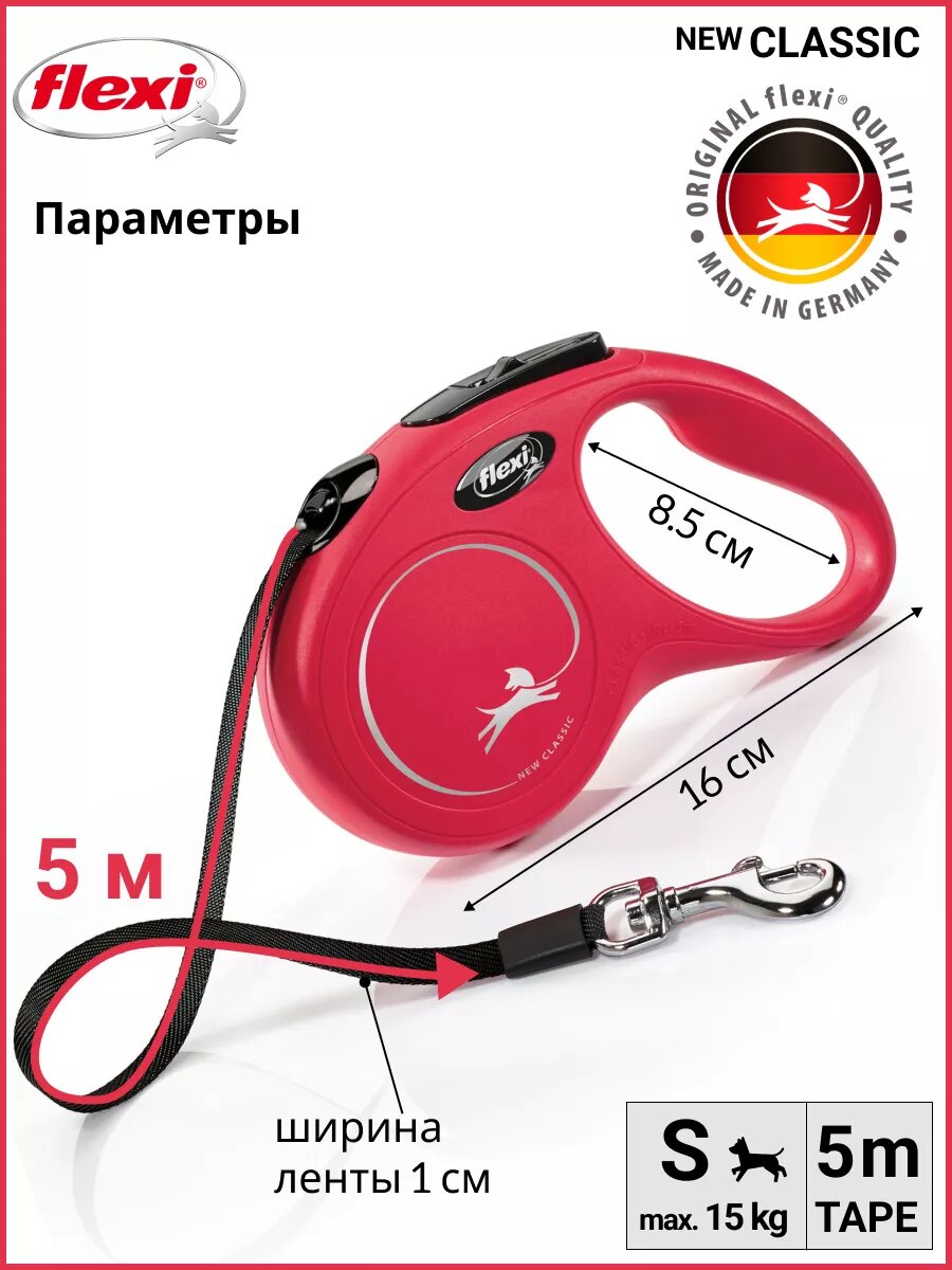 FLEXI NEW CLASSIC TAPE – Флекси ременной поводок-рулетка для животных, 5 м, размер S, красный (1 шт)