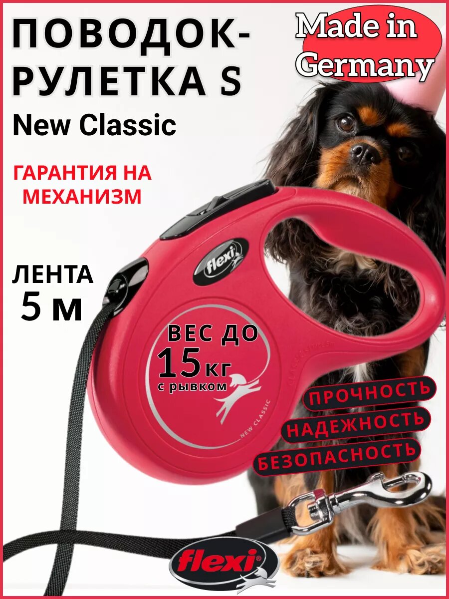 Flexi New Classic S 5м до 15кг поводок-рулетка ремень, красный