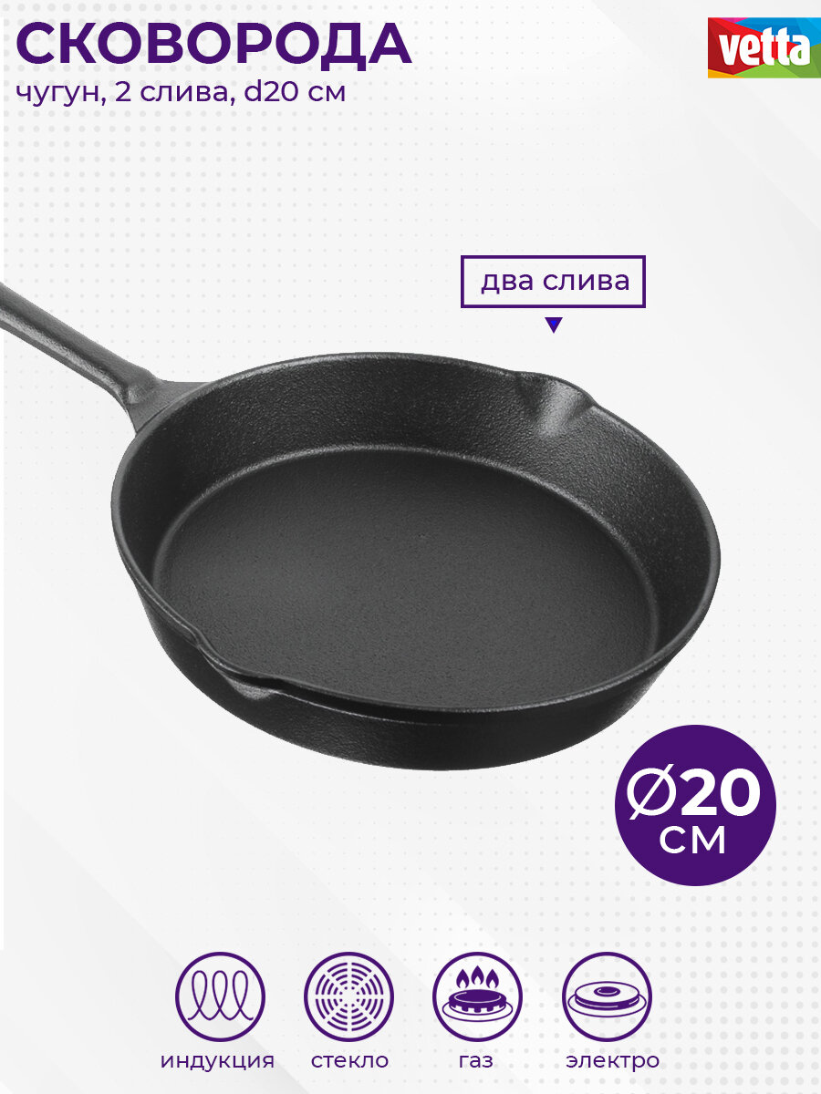 Купить Сковорода 20 см чугунная VETTA, 2 слива, индукция, без крышки