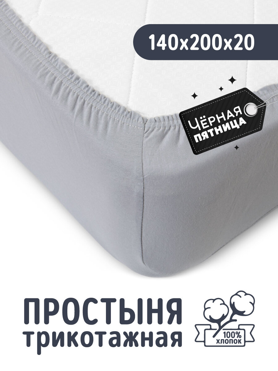 Простыня на резинке Серая, 140х200х20, трикотаж, 100% хлопок