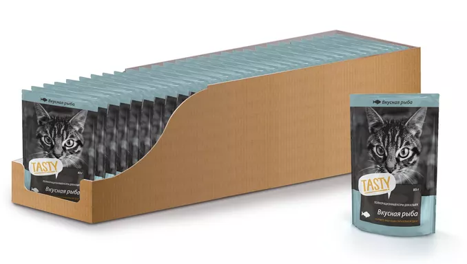 СохранитьКорм для кошек блок 28 шт * 85 г Тэсти (Tasty) рыба в желе/Россия интересное: