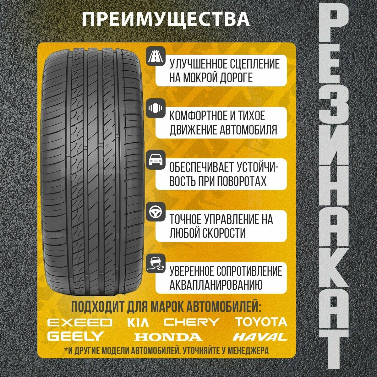 | Плюсы: | Тихая, хорошая износостойкость, хорошо отводит воду в луже. |