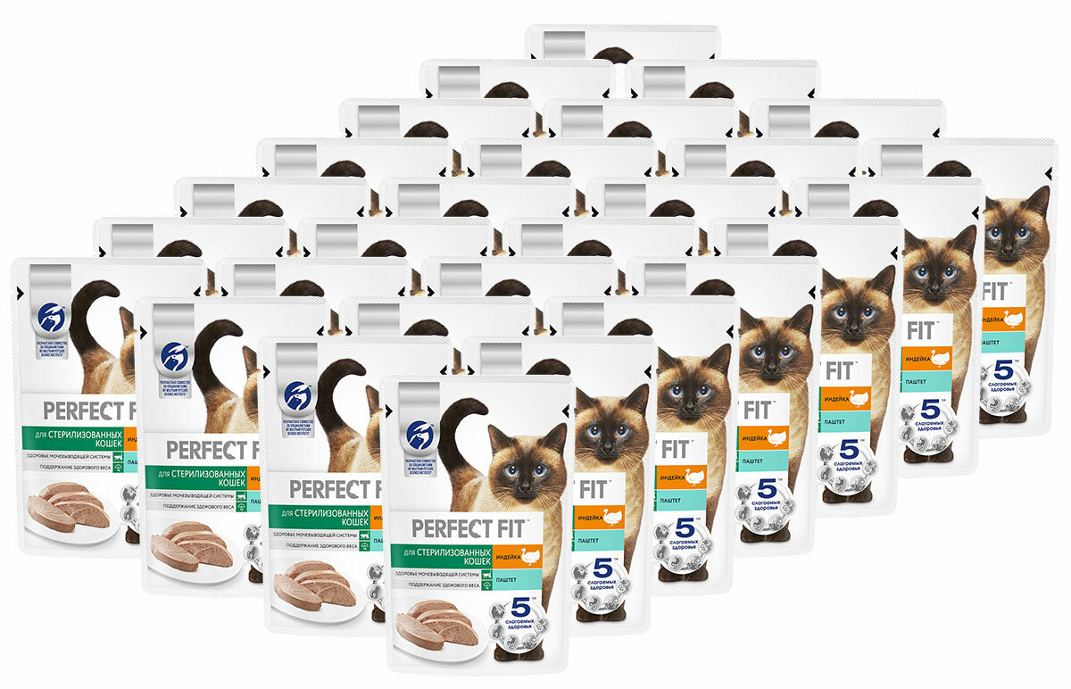 Купить Влажный полнорационный корм PERFECT FIT для стерилизованных кошек, паштет с индейкой, 28 шт по 75 г