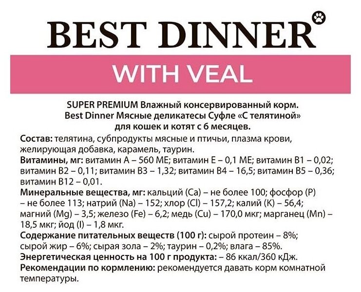 Best Dinner консервы для кошек и котят с 6 месяца мясные деликатесы суфле с телятиной пауч 24х85г