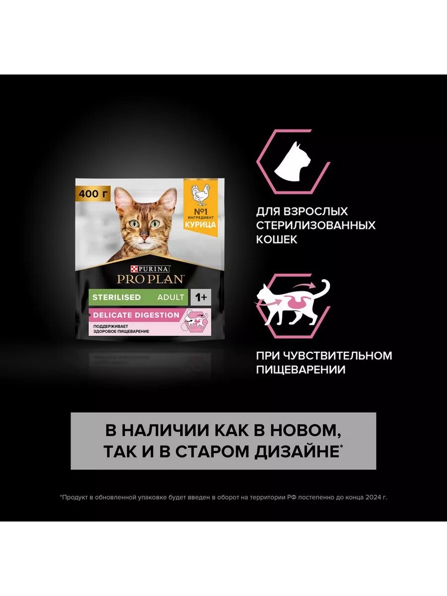 Сухой корм Pro Plan для стерилизованных кошек и кастрированных котов с чувствительным пищеварением, с курицей, Пакет, 400г