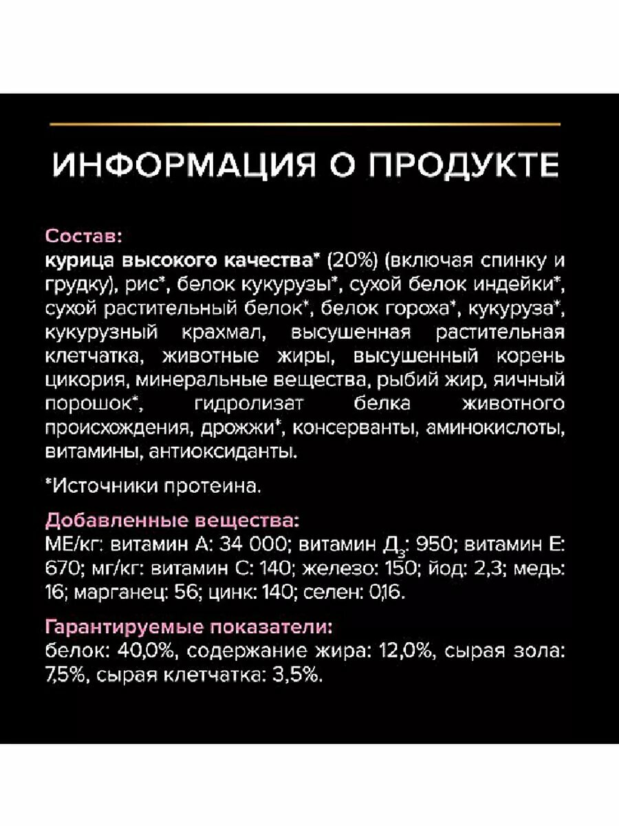 | Отзыв: | Питание моей кошки преимущественно состоит из сухого корма, поэтому при выборе я в первую очередь обращаю внимание на его состав. Корм Pro Plan для стерилизованных кошек содержит 40% белка, половину которого составляет именно курица. Помимо белка, в состав входят минеральные вещетсва, витамины, антиоксиданты и клетчатка, превращающие этот корм в полноценный рацион. Содержание жира всего 12%: это поможет кошке оставаться в форме и защитит от лишнего веса. Pro Plan действительно поддерживает здоровье пищеварительной и мочевыводящей системы, а также придает шёрстке гладкость и блеск.