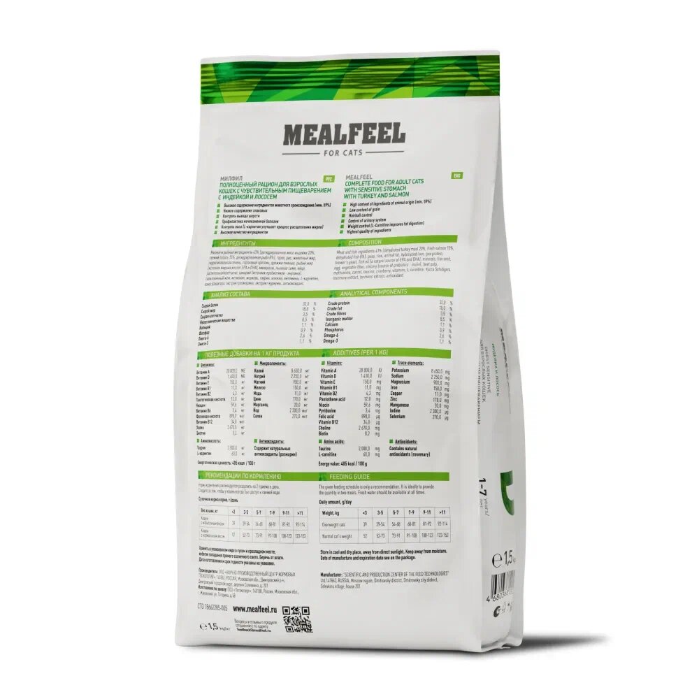 Купить MEALFEEL DIGEST SENSITIVE Сухой корм для кошек с чувствительным пищеварением Индейка/Лосось 1,5 кг
