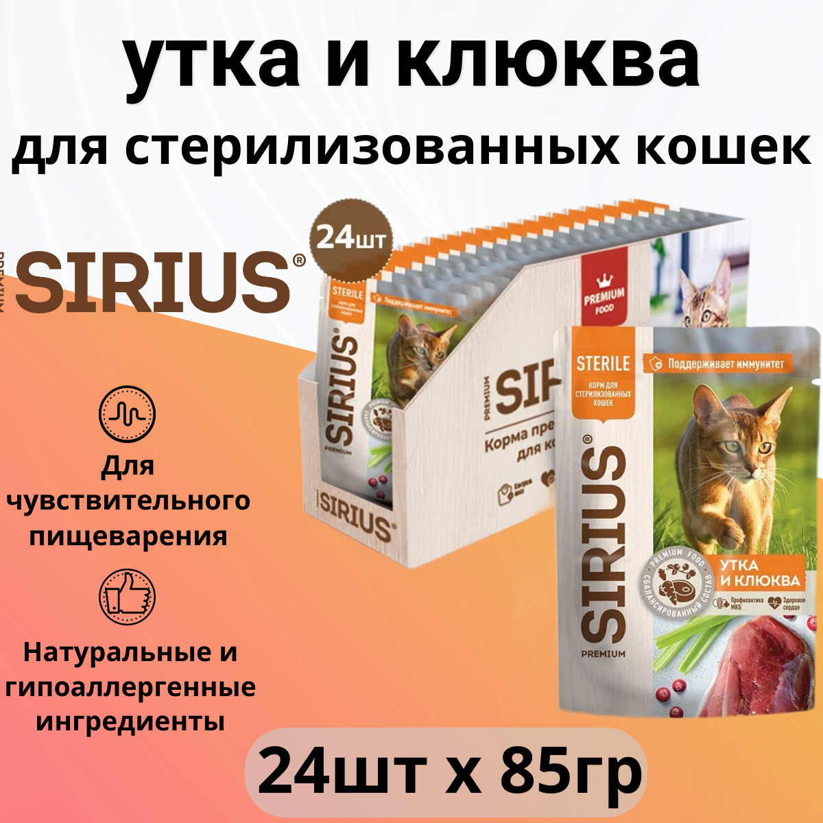 Влажный корм SIRIUS для кастрированных котов и стерилизованных кошек, утка с клюквой, пауч, 85гр*24шт
