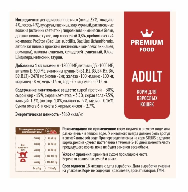 Сухой корм сириус SIRIUS PREMIUM для взрослых кошек, мясной рацион, 3 шт по 400 г