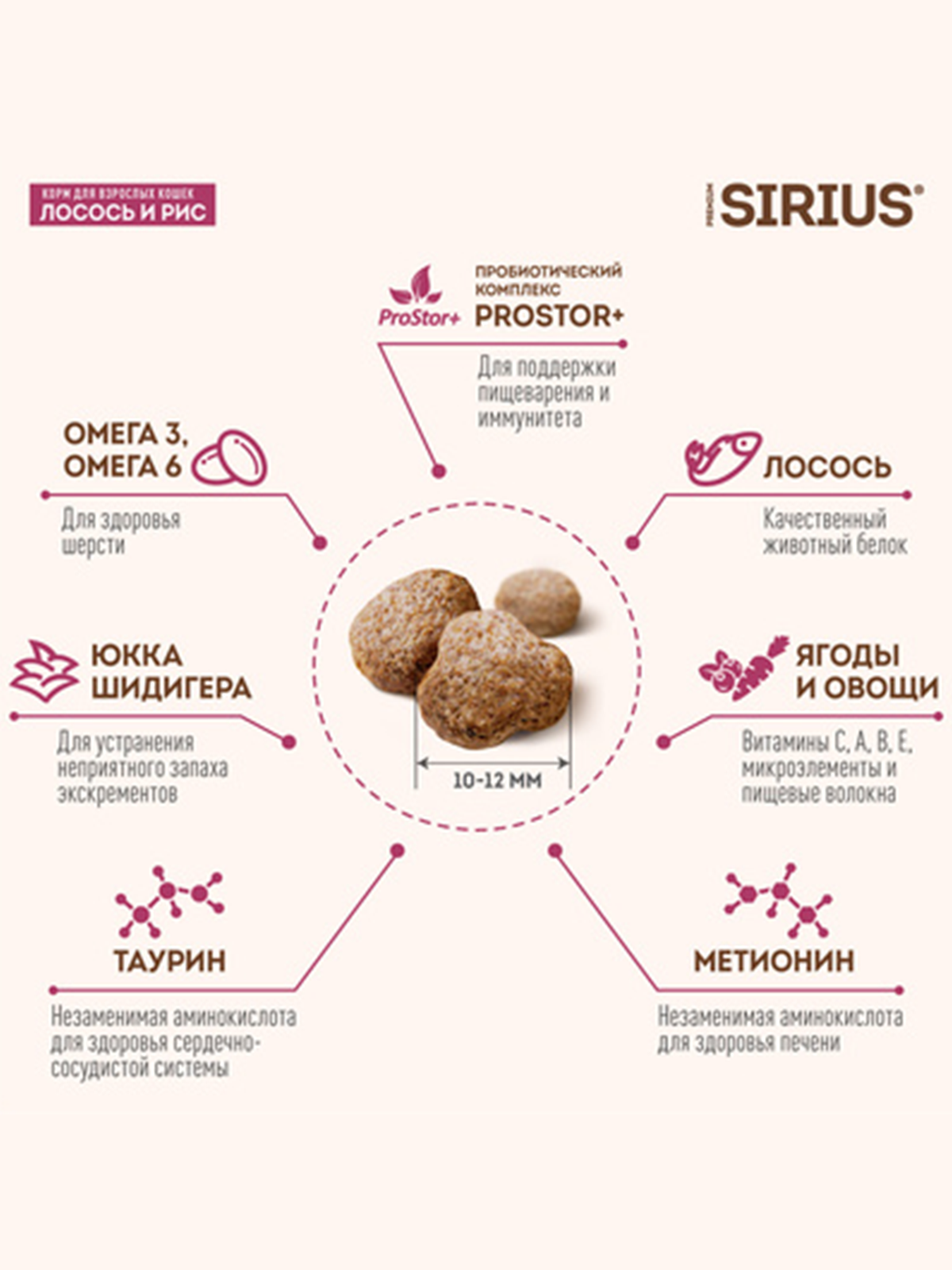 Сухой корм сириус SIRIUS PREMIUM для взрослых кошек, лосось и рис, 10 кг