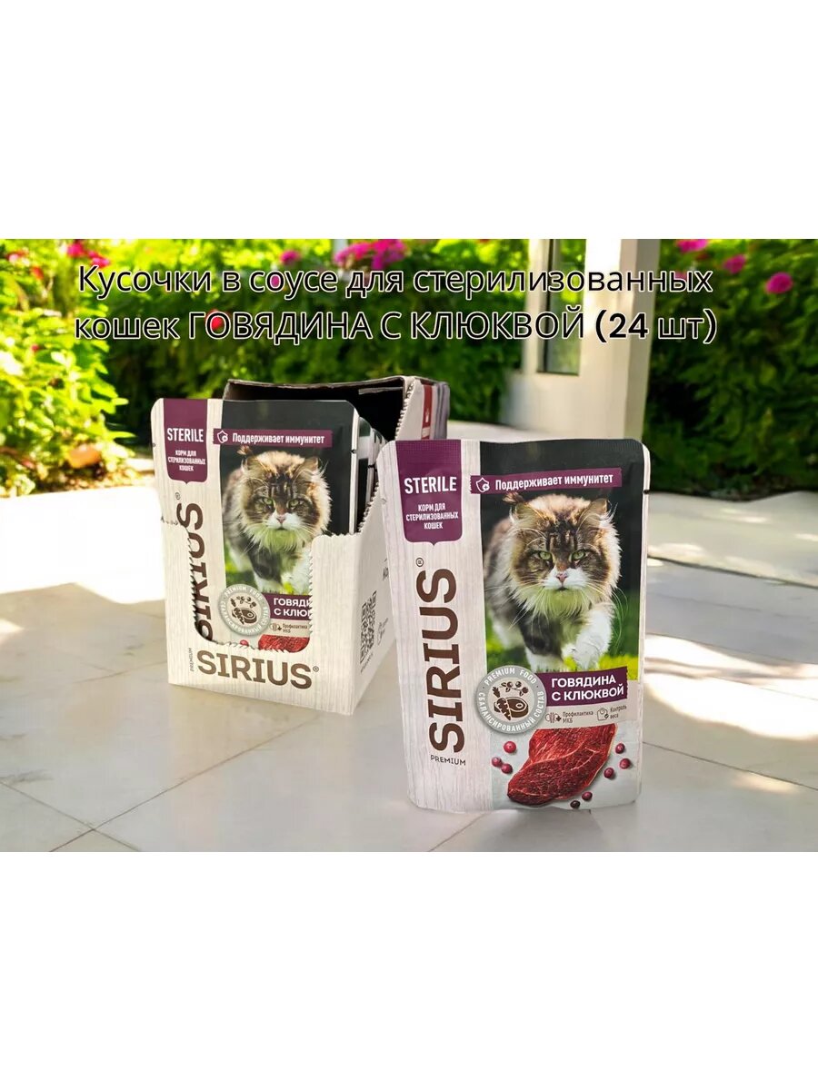 Купить Влажный корм SIRIUS для стерилизованных кошек, кусочки в соусе, говядина с клюквой, 85 гр * 24 шт