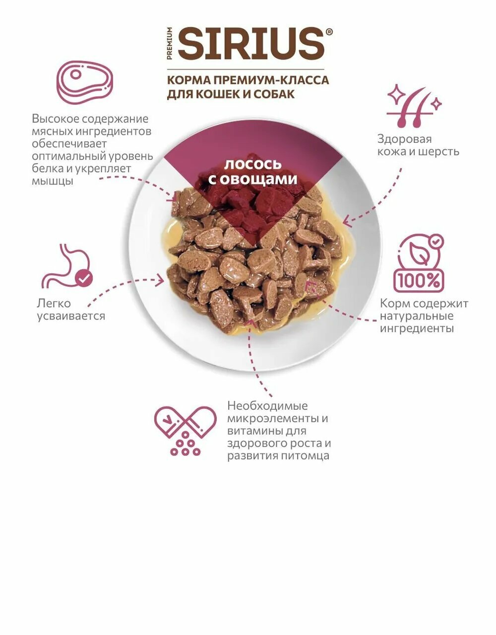Влажный корм SIRIUS для кошек, кусочки в соусе, лосось с овощами, 85 гр * 24 шт