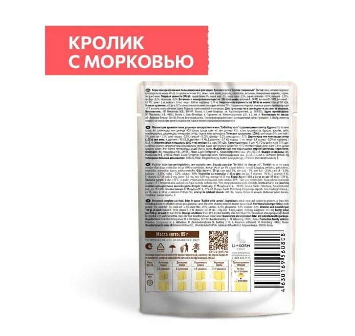 СохранитьВлажный корм SIRIUS для кошек , кусочки в соусе, кролик с морковью, 24 шт х 85 г интересное: