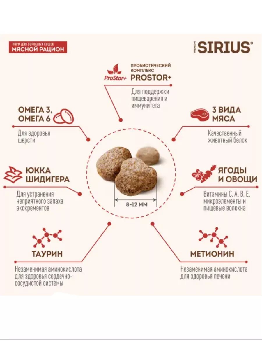 Сухой корм сириус SIRIUS PREMIUM для взрослых кошек, мясной рацион, 3 шт по 400 г