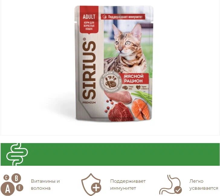 Сухой корм сириус SIRIUS PREMIUM для взрослых кошек, мясной рацион, 3 шт по 400 г