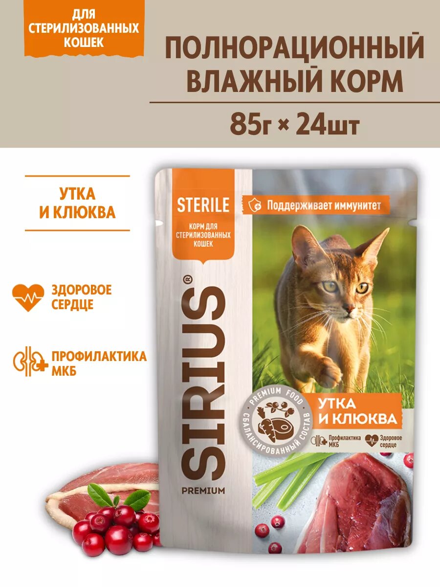 Влажный корм SIRIUS для кастрированных котов и стерилизованных кошек, утка с клюквой, пауч, 85гр*24шт