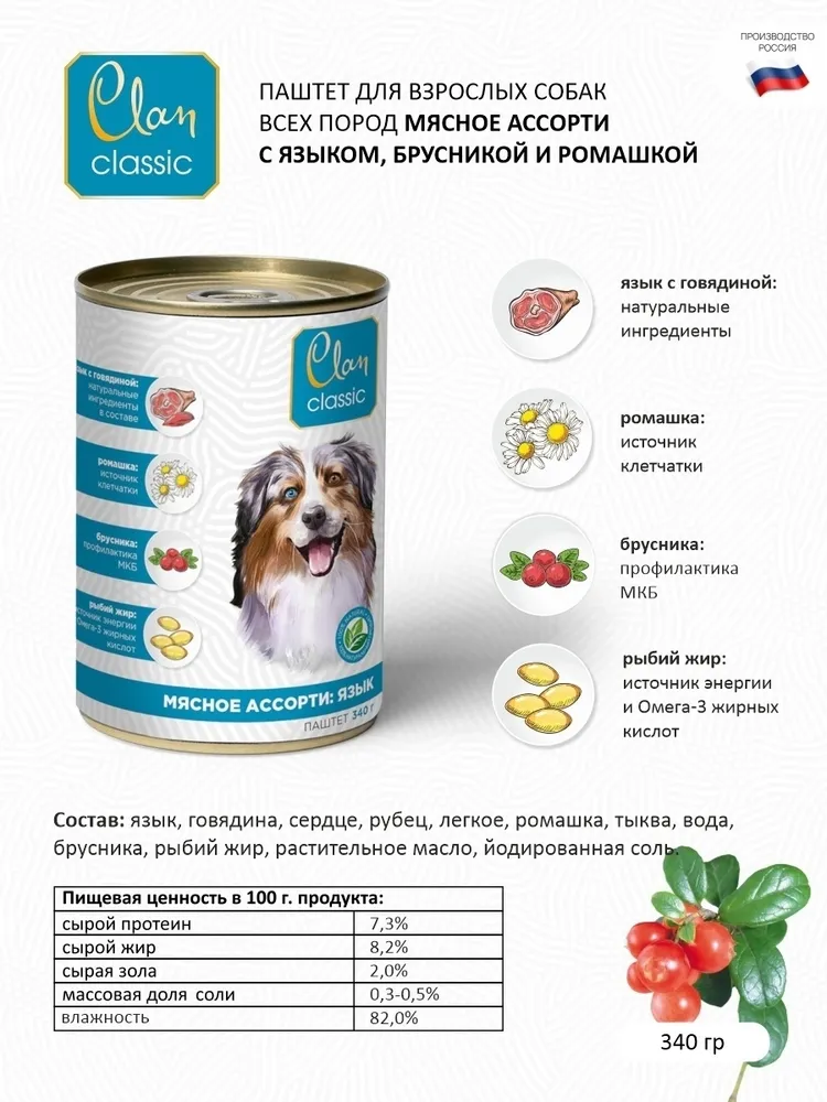 Влажный корм для собак CLAN Classic Мясное ассорти Мясное ассорти, язык 340 г