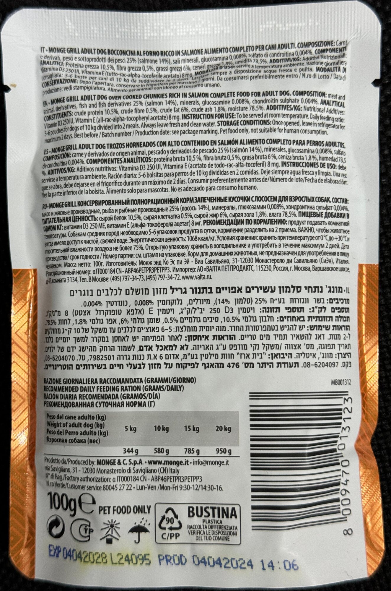 Ниже Вы можете прочитать отзывы на Влажный корм для взрослых собак Monge GRILL POUCH SALMONE, с лососем, 100 г, 1 шт., ознакомится с подробными характеристиками, посмотреть интересные обзоры и фотографии на Влажный корм для взрослых собак Monge GRILL POUCH SALMONE, с лососем, 100 г, 1 шт..
