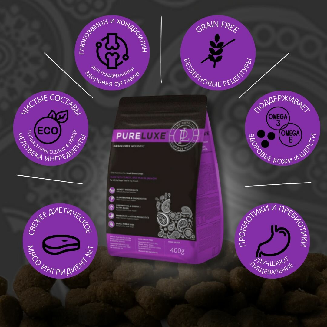 Сухой беззерновой корм класса холистик PureLuxe Пурлюкс для мелких и карликовых пород собак на всех этапах жизни со свежей индейкой, горошком и лососем, 400 гр.