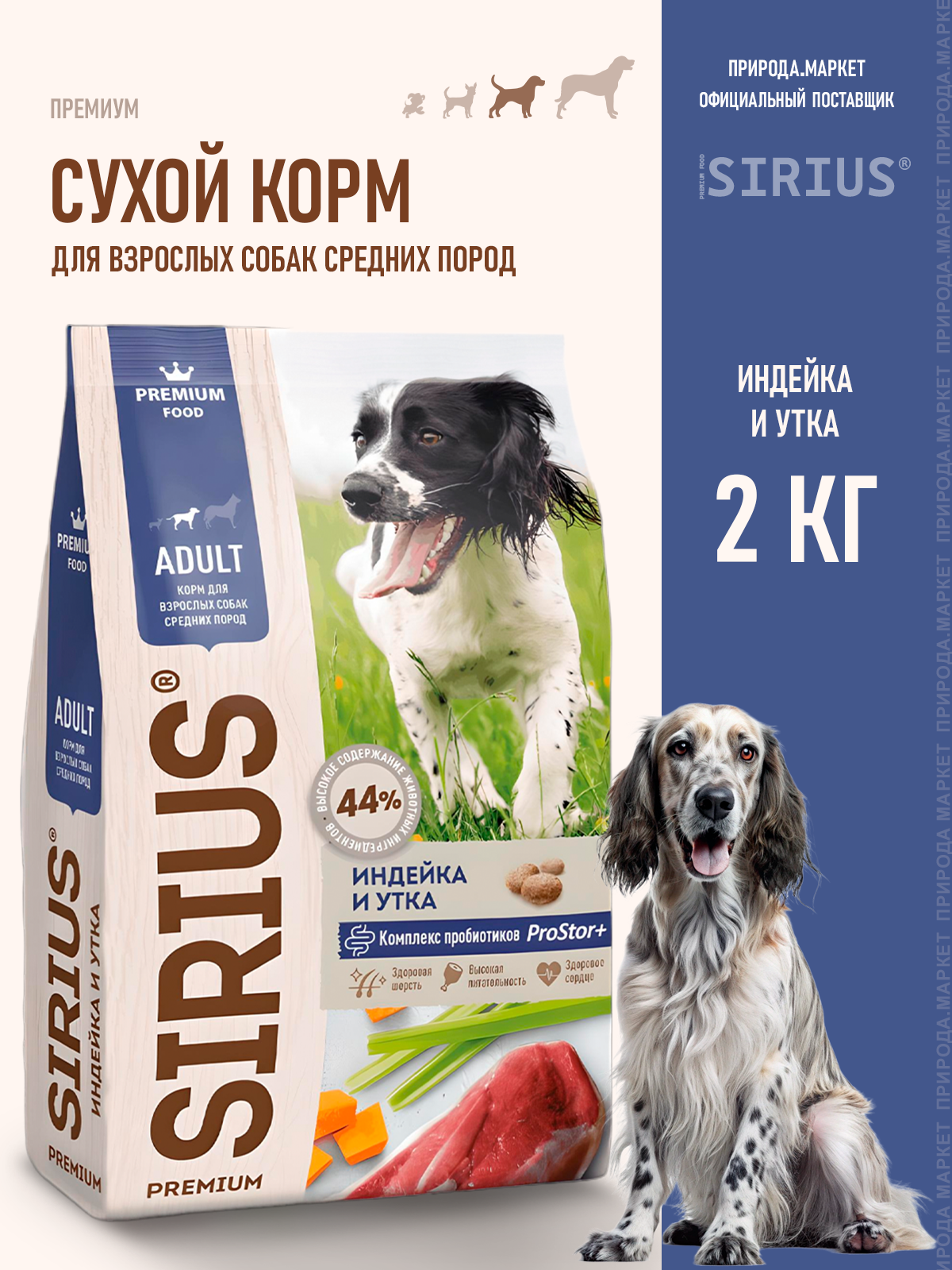 Сухой корм Sirius полнорационный для собак средних пород, с индейкой и уткой с овощами 2 кг