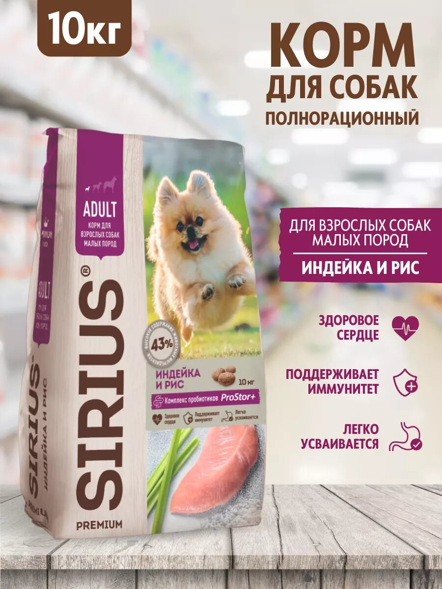 Sirius Сириус сухой полнорационный корм для взрослых собак малых пород Индейка и рис 10кг