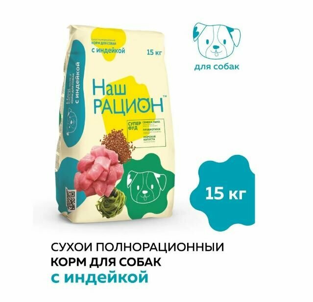 Корм сухой Наш Рацион полнорационный для взрослых собак, Индейка, 15 кг