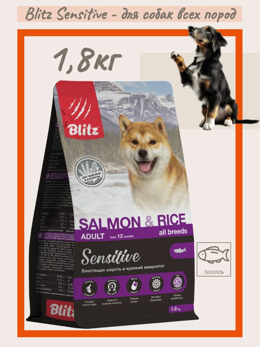 BLITZ SENSITIVE ADULT ALL BREEDS SALMON & RICE для взрослых собак всех пород с лососем и рисом 1,8 кг