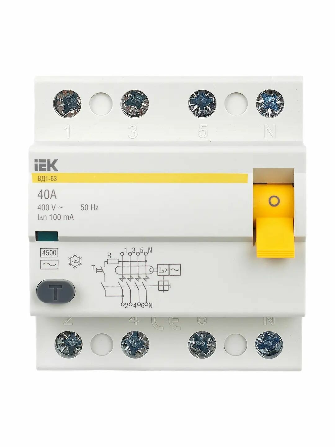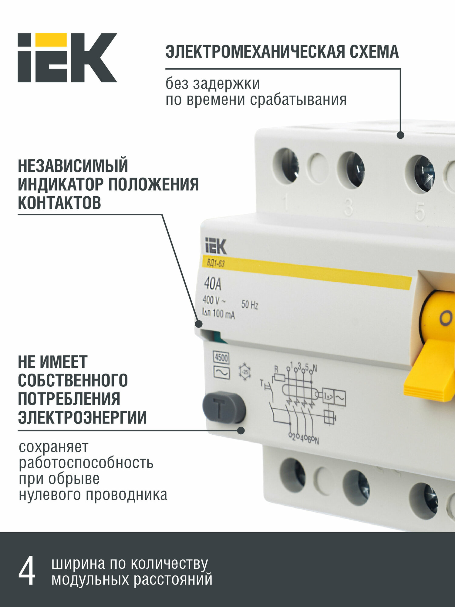 Выключатель дифф.тока УЗО IEK ВД1-63 MDV10-4-040-100 40A 100мА AC 4П 400В 4мод белый (упак.:1шт) MDV