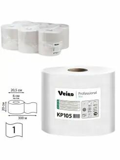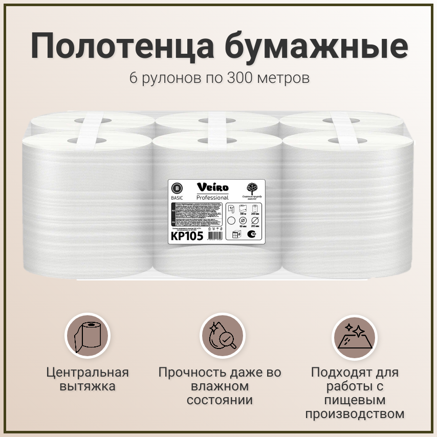 Полотенца бумажные Veiro Professional Basic KP105 рулонные, с центральной вытяжкой, однослойные, 1 упаковка - 6 рулонов по 300 метров