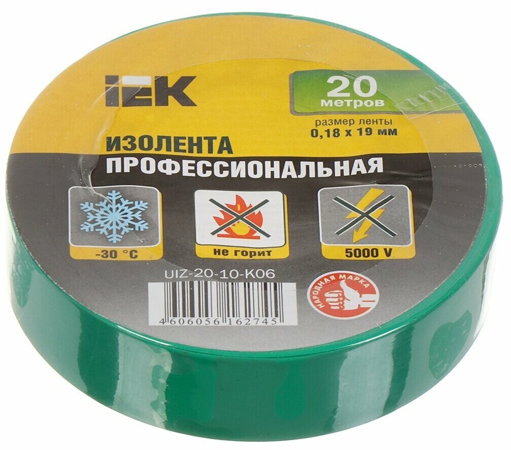 Изолента ПВХ зеленая 19х20м UIZ-20-10-K06 IEK