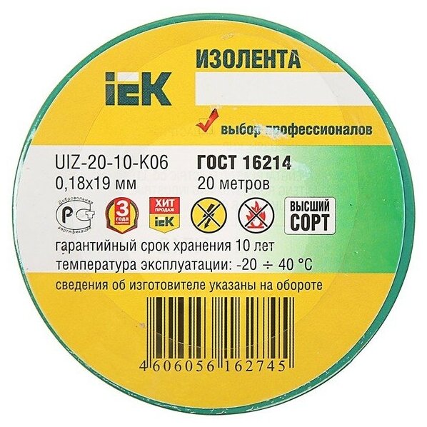 Iek UIZ-20-10-K52 Изолента 0,18х19 мм желто-зеленая 20 метров ИЭК