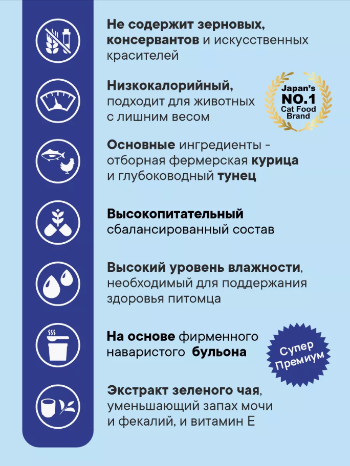 | Плюсы: | Натуральный, отличная консистенция, аппетитный аромат. Кисуля обожает этот корм, даже мисочку вылизывает, а другие корма в основном не доедает. Японцы знают толк в вкусняшках для кошечек :-) |