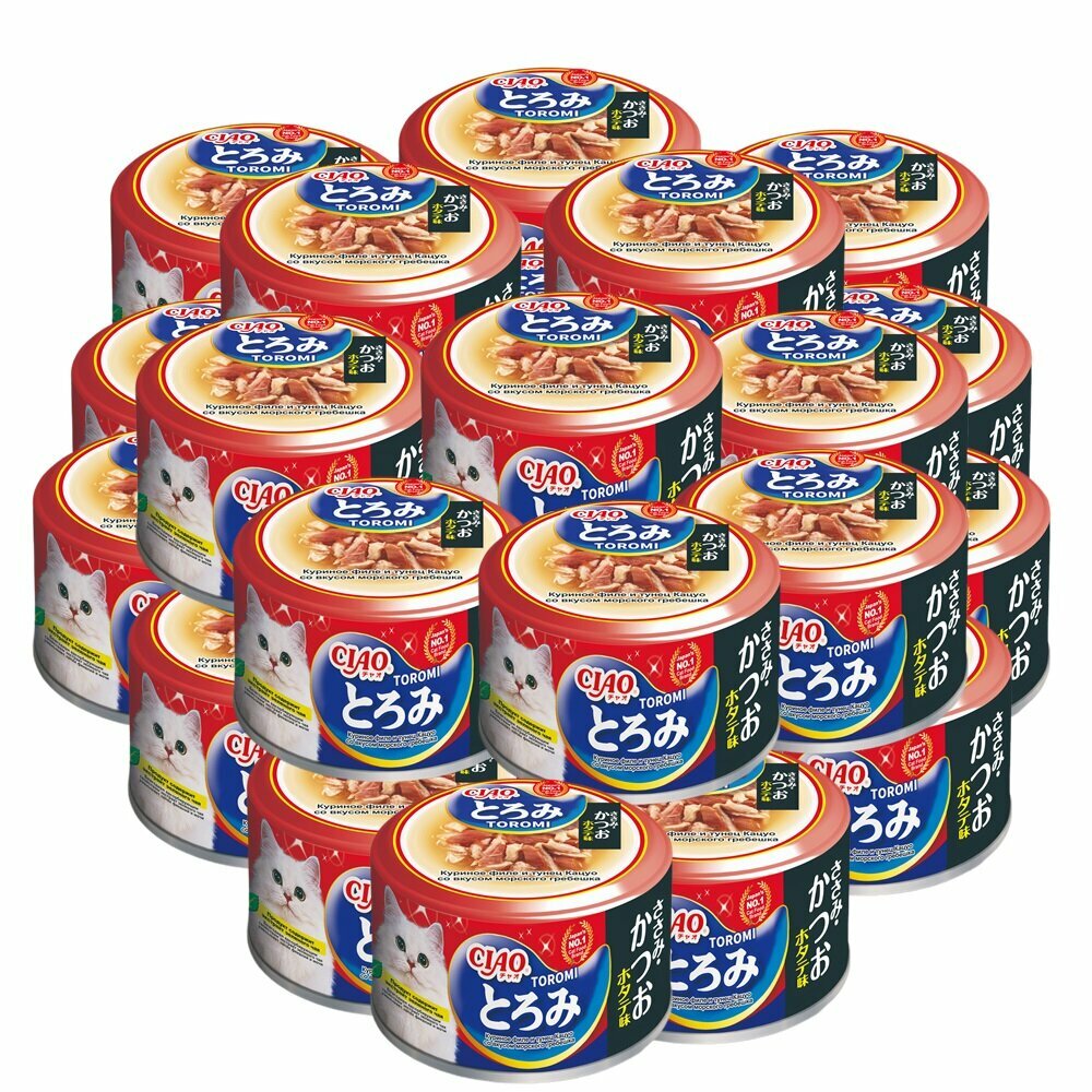 Inaba Ciao Toromi консервы для взрослых кошек с куриным филе, тунцом кацуо, со вкусом морского гребешка, в бульоне - 80 г х 24 шт