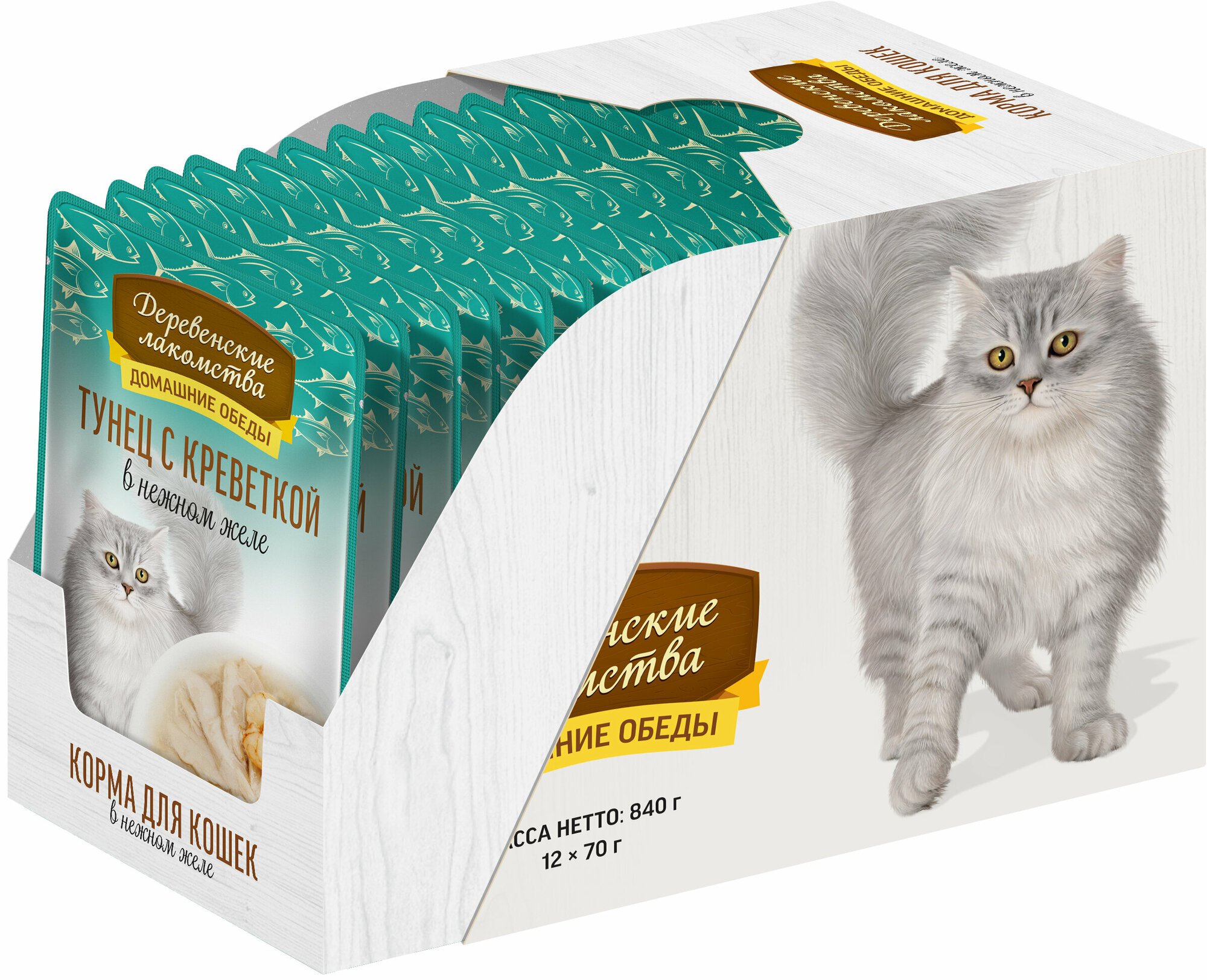 Купить Деревенские лакомства пауч для кошек (кусочки в нежном желе) Тунец и креветки, 70 г. упаковка 12 шт