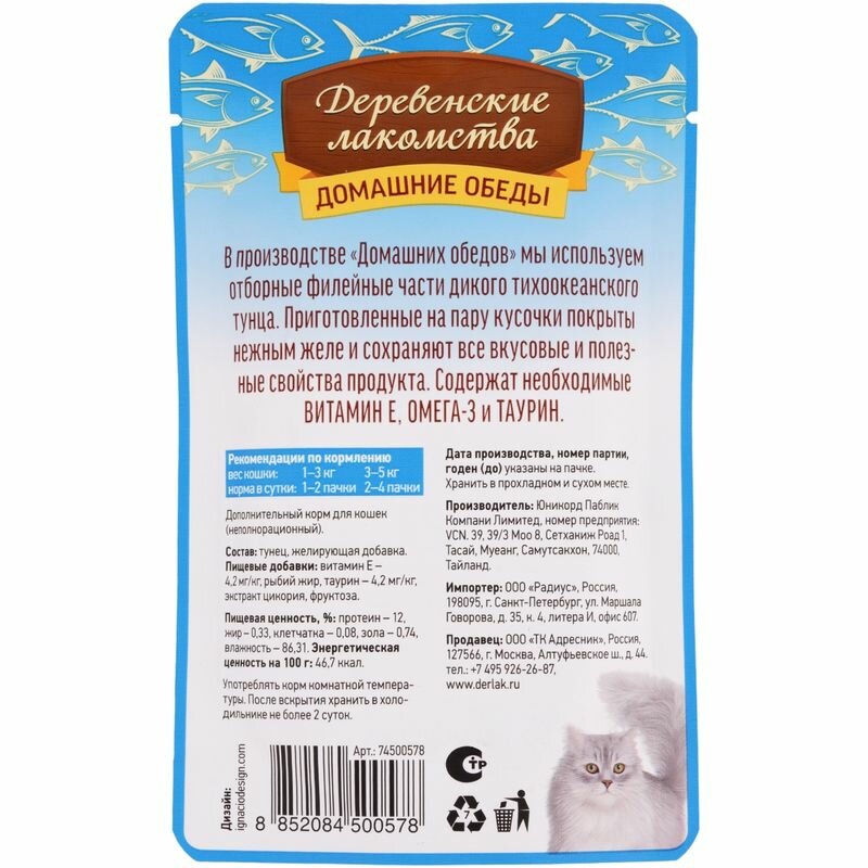 Корм для кошек деревенские лакомства Филейный тунец в нежном желе пауч 70г (упаковка - 12 шт)