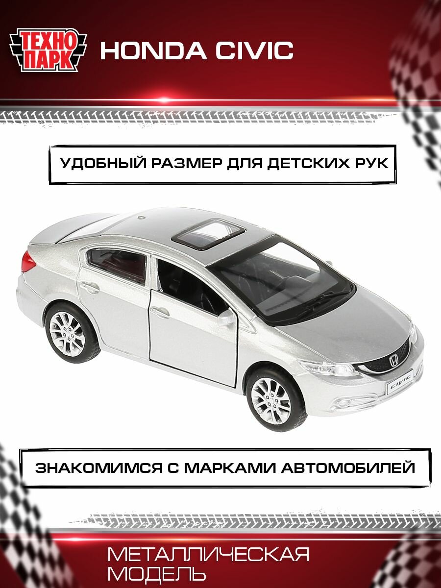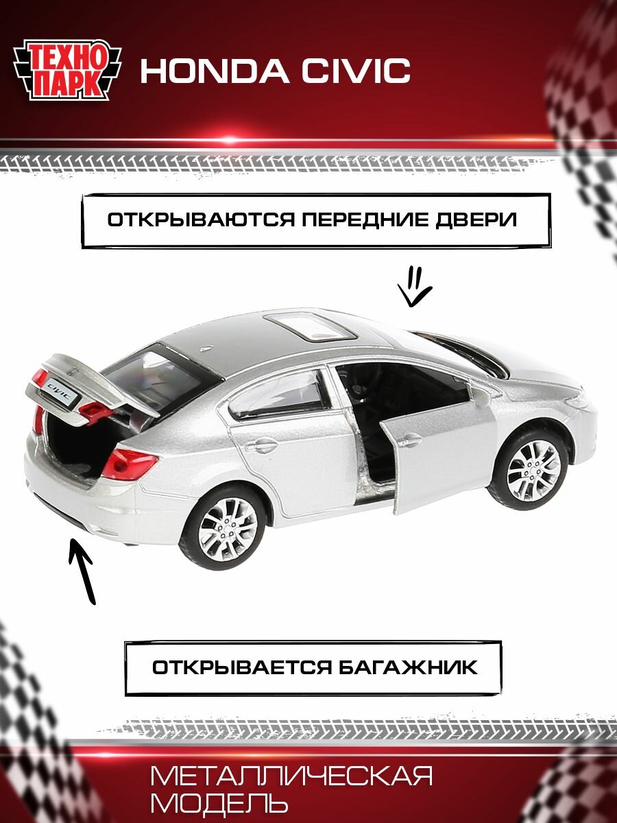 Купить Машинка детская Honda Civic 12 см, Технопарк, серебристая, открываются двери и багажник, металлический корпус