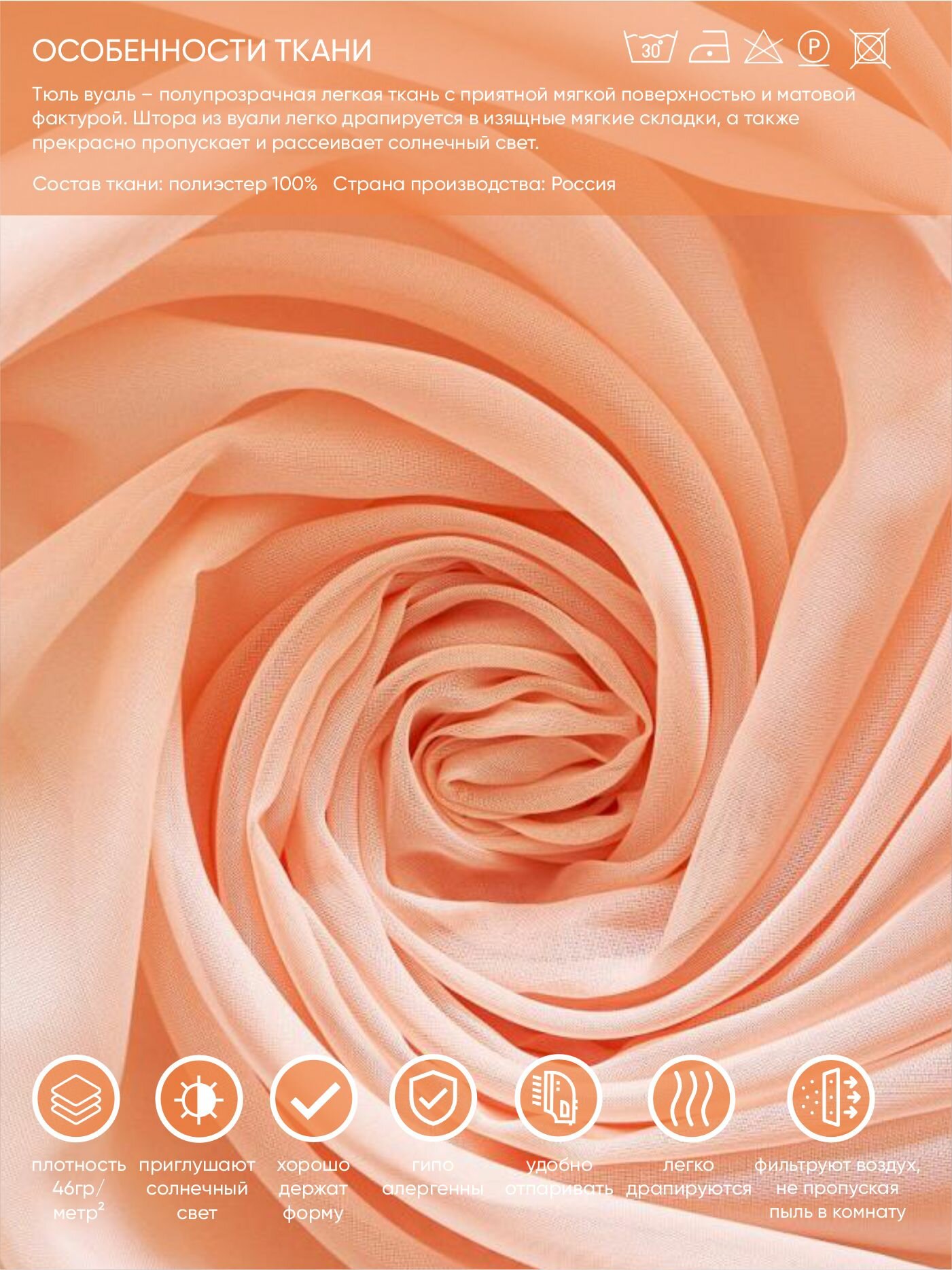 Штора вуаль однотонная 140*145 см, цвет персик, 100% п/э Witerra 7420446 .