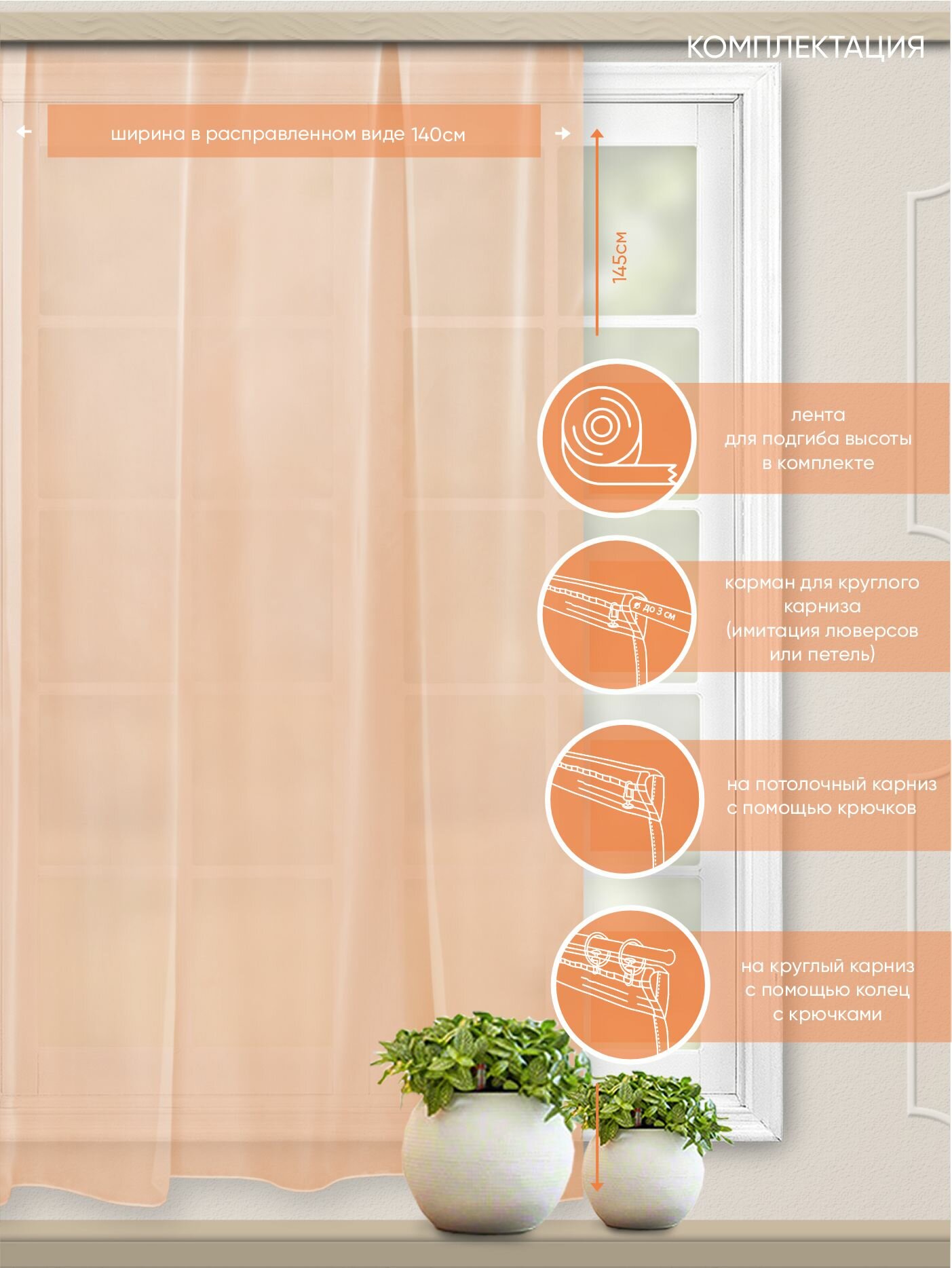 СохранитьШтора на кухню короткая Witerra тюль для потолочного и круглого карнизов, 140х145 см, персик, 1 шт. интересное: