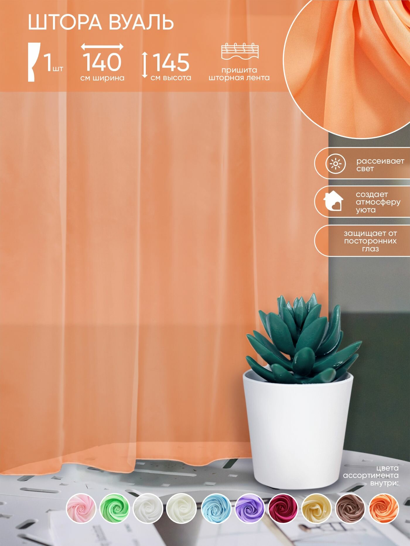 Штора вуаль однотонная 140 145 см, цвет персик, 100 п/э