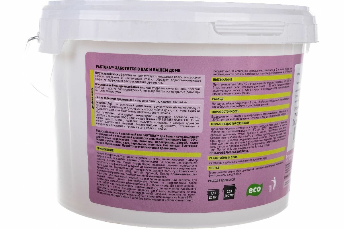 Купить FAKTURA лак для бань и саун термостойкий до 120С с ионами серебра и натуральным воском 2,7л О02540