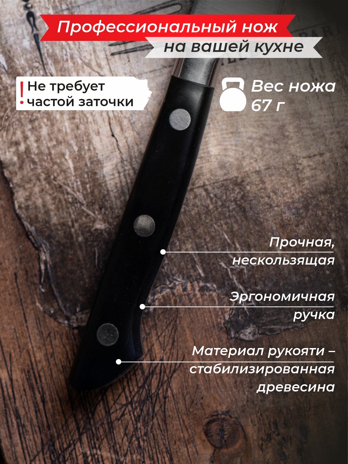 Удобная рукоять кухонного ножа приятно лежит в руке, лезвие идеально заточено, никаких проблем с ножом уже долгое время. сталь отличного качества, не боится химии, но требует бережного отношения.