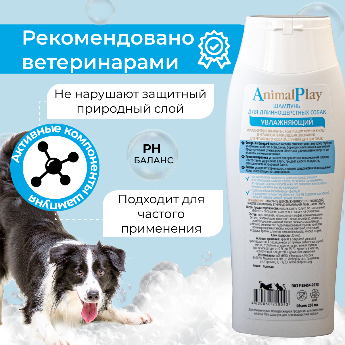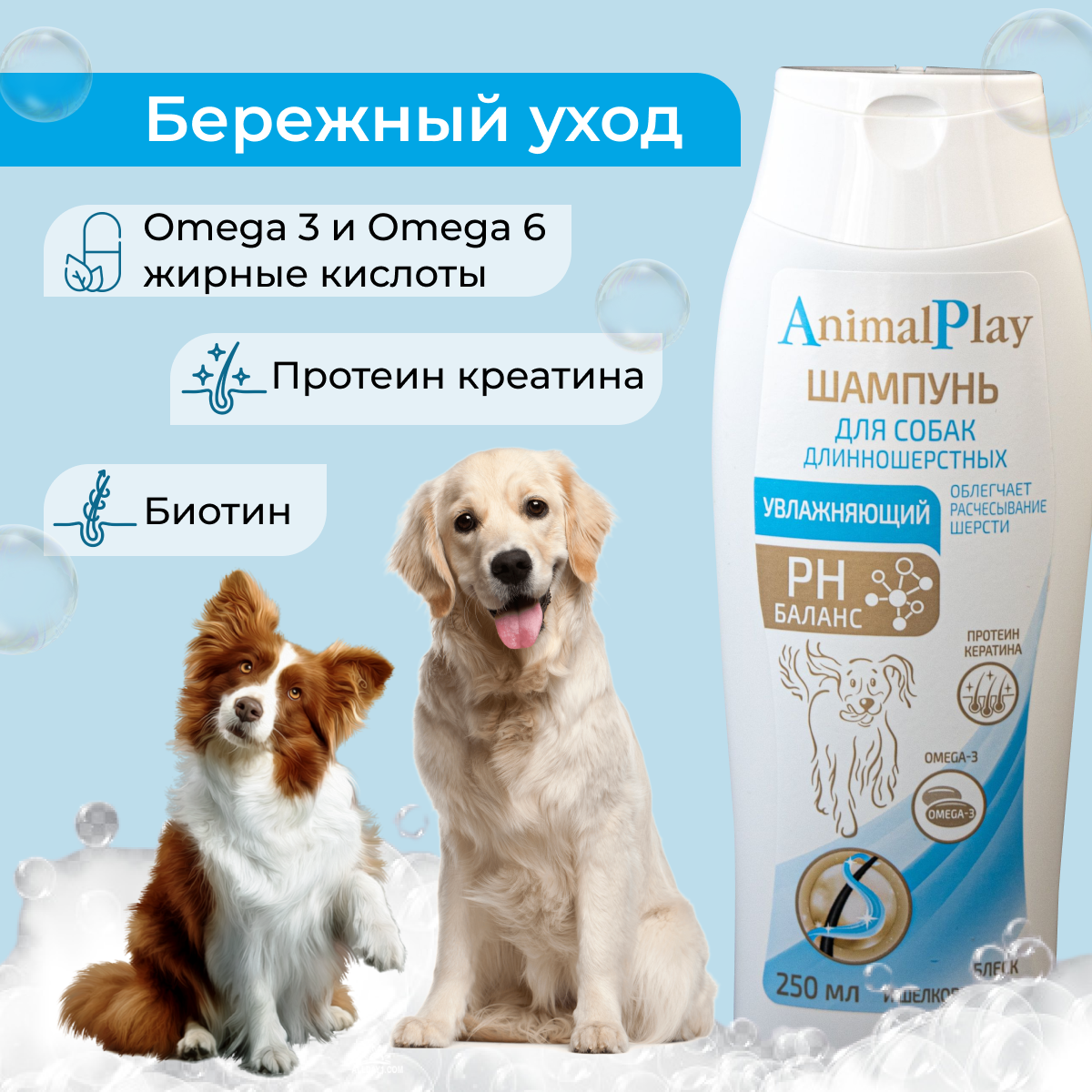 Animal Play Шампунь для собак длинношерстных Увлажняющий с Omega 3 и кератином, 250 мл