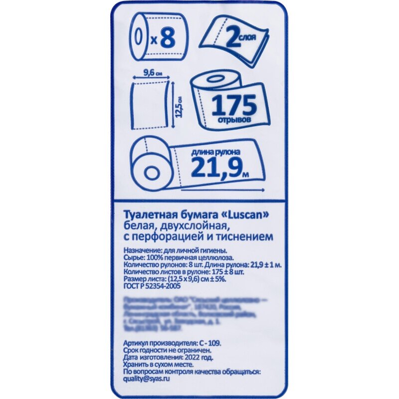 Туалетная бумага Luscan Comfort, 2 слоя, белая, 100% целлюлоза, 21,88 м, 175 л, 8 рулонов