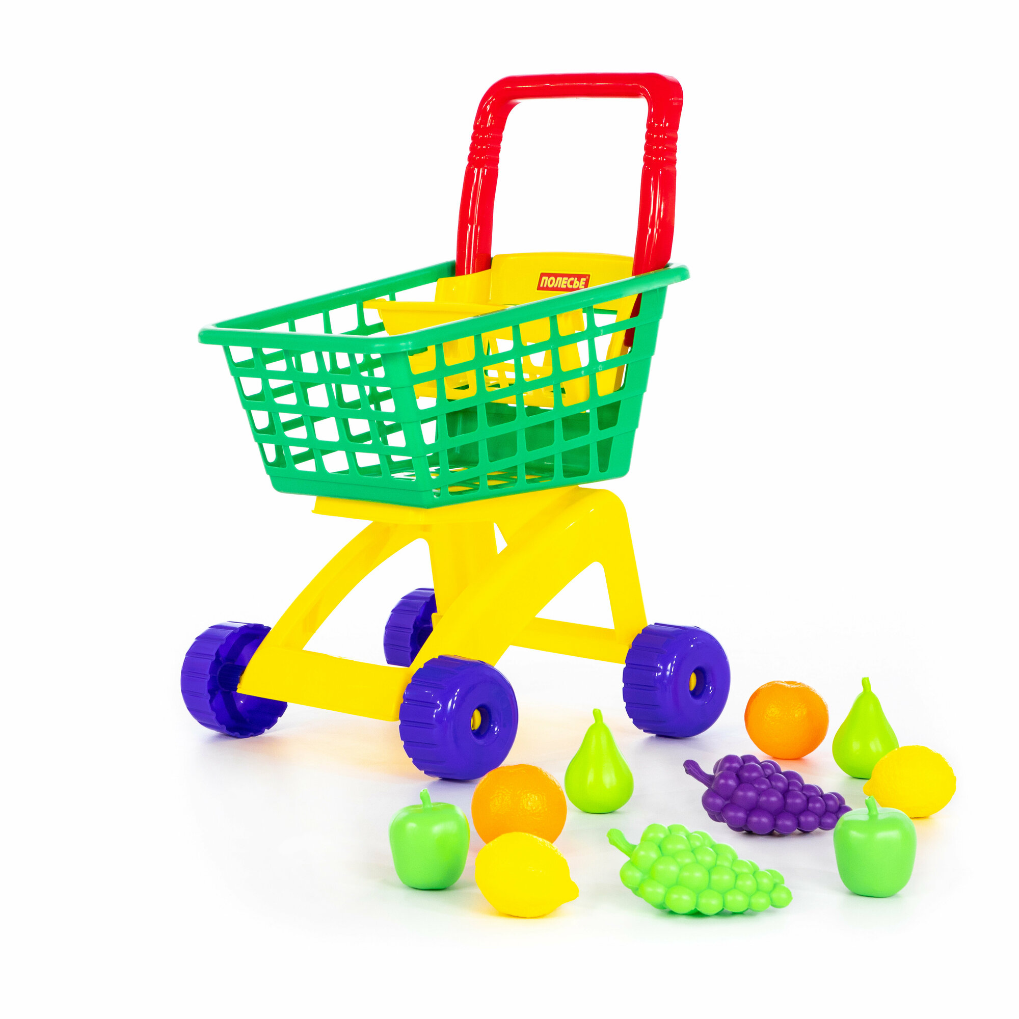 Игровой набор Полесье Тележка для маркета Мини, фиолетовая с набором продуктов №15 (12 предметов) в сеточке П-71392/фиолетовый