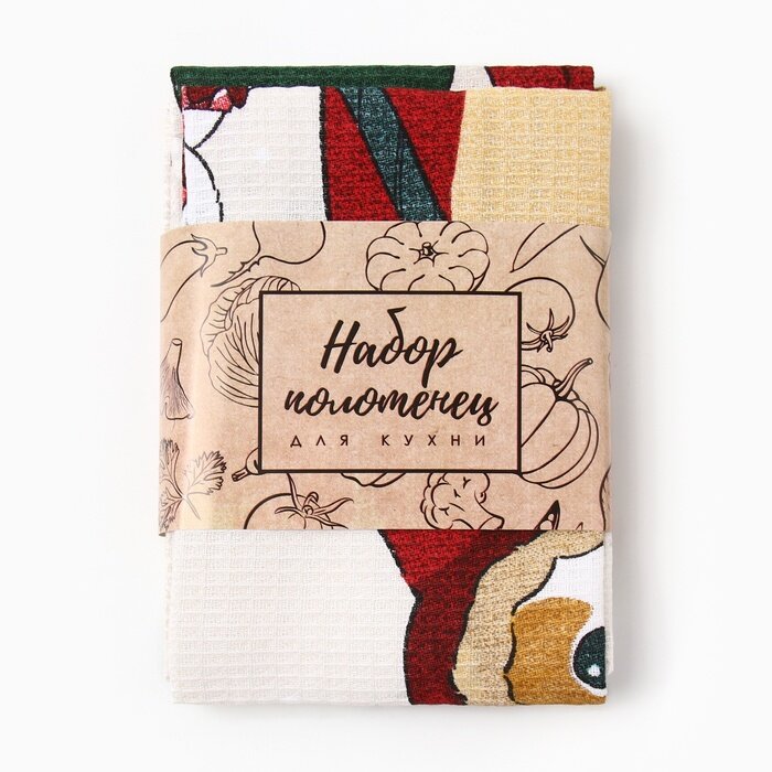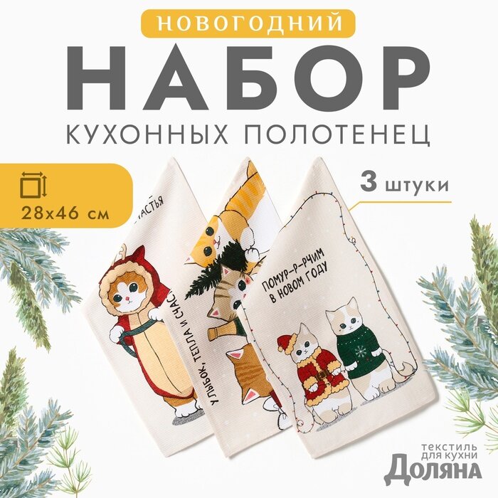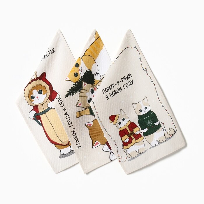 Купить Набор новогодних полотенец Доляна "Помурчим в новом году" 28х46 см - 3штуки, 100% хлопок, вафля 160 г/м2