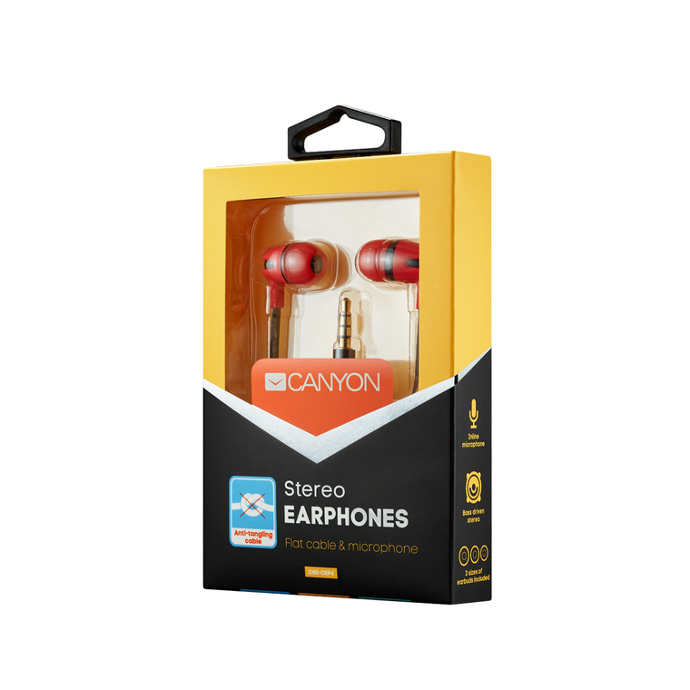 Наушники, Canyon Stereo earphone with microphone, 1.2m flat cable, Red, 22*12*12mm, 0.013kg. CNSCEP4