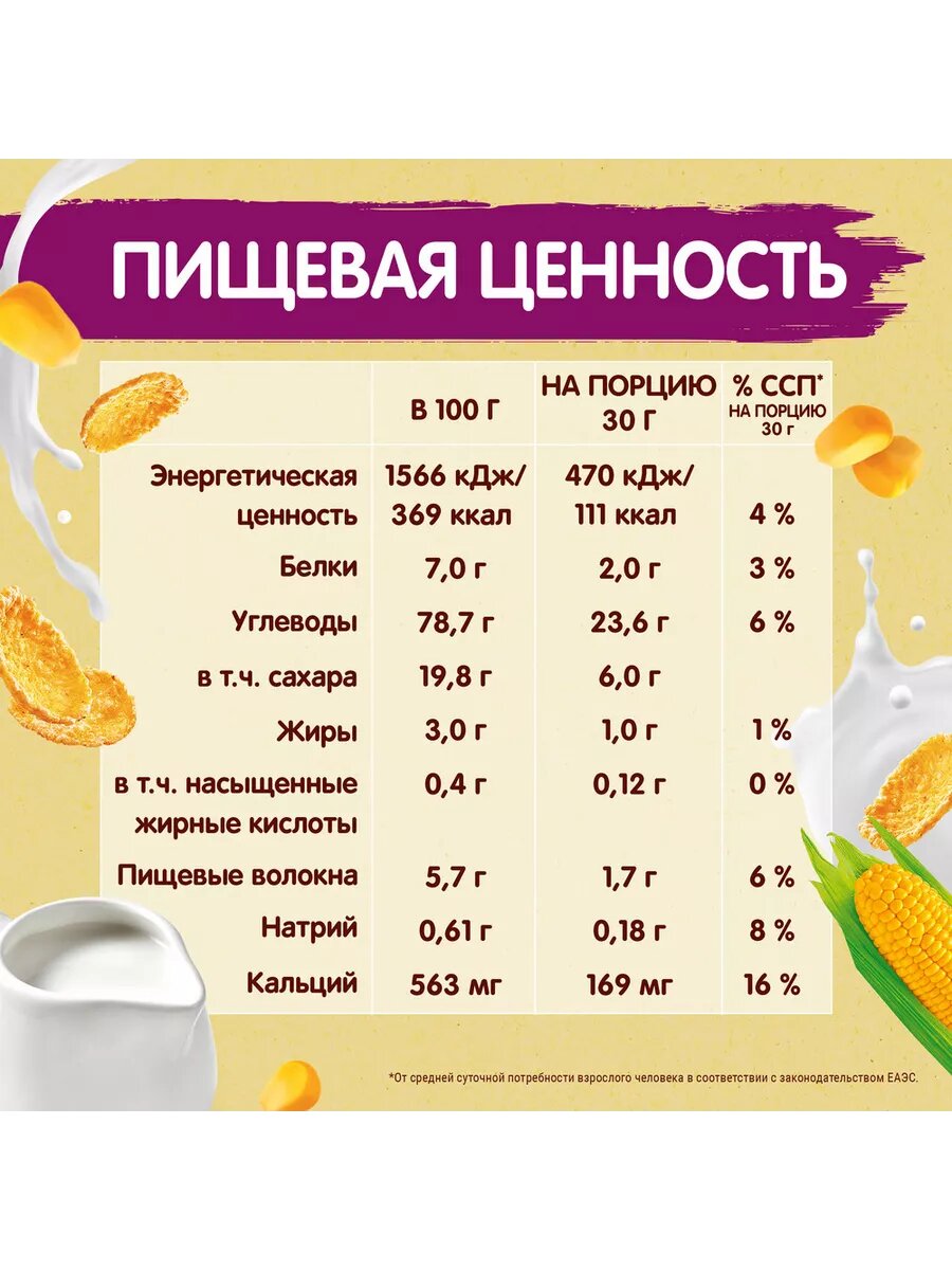СохранитьХлопья кукурузные,хрустящие,обогащенные кальцием, 320г 6шт интересное: