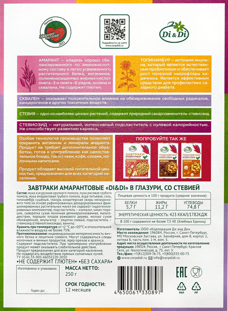 Завтраки амарантовые "Di&Di" в глазури, 250г