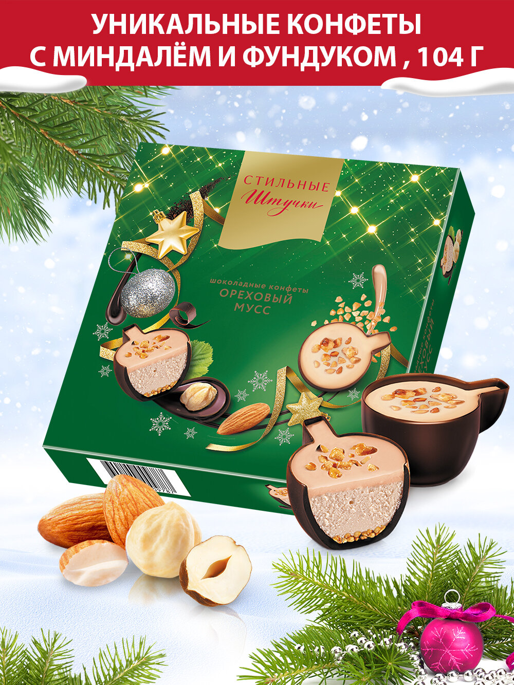 Ниже Вы можете прочитать отзывы на Конфеты шоколадные Стильные штучки Ореховый мусс подарочные в новогодней коробке, 104 г, ознакомится с подробными характеристиками, посмотреть интересные обзоры и фотографии на Конфеты шоколадные Стильные штучки Ореховый мусс подарочные в новогодней коробке, 104 г.